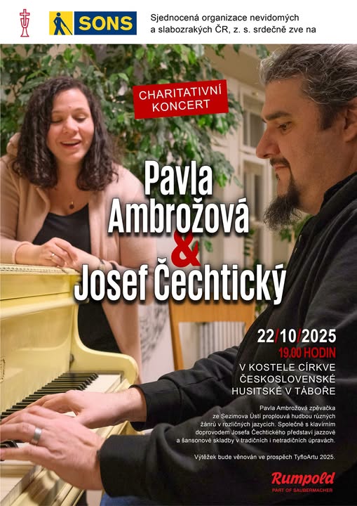 POZVÁNKA NA KONCERT V TÁBORSKÉM KOSTELE Srdečně zveme na benefiční koncert Pavly Ambrožové a Josefa Čechtického, který se uskuteční 22. října od 19 hodin v prostorách husitského kostela v Táboře. Podrobnosti naleznete na webových stránkách táborského sboru.