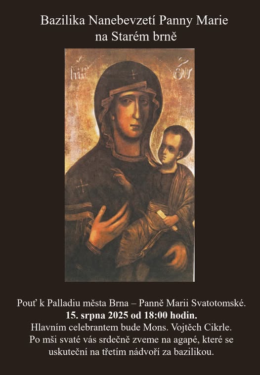 V pátek 15. srpna jsme zváni na slavení poutní mše do baziliky Nanebevzetí Panny Marie na Starém Brně. Hlavním celebrantem poutní mše v 18 hod.