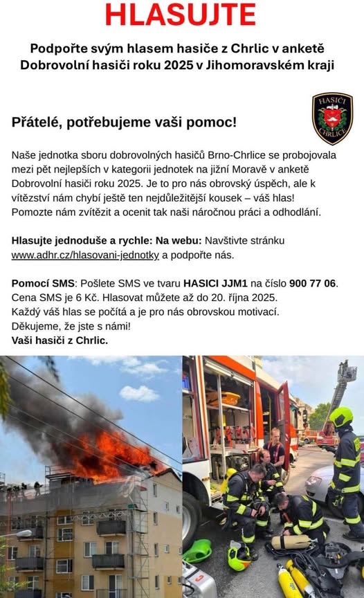 🔥 Podpořte svým hlasem hasiče z Brna–Chrlic, kteří se probojovali mezi pět nejlepších jednotek v Jihomoravském kraji v anketě Dobrovolní hasiči roku 2025. Hlasovat můžete online nebo pomocí SMS až do 20. října 2025.