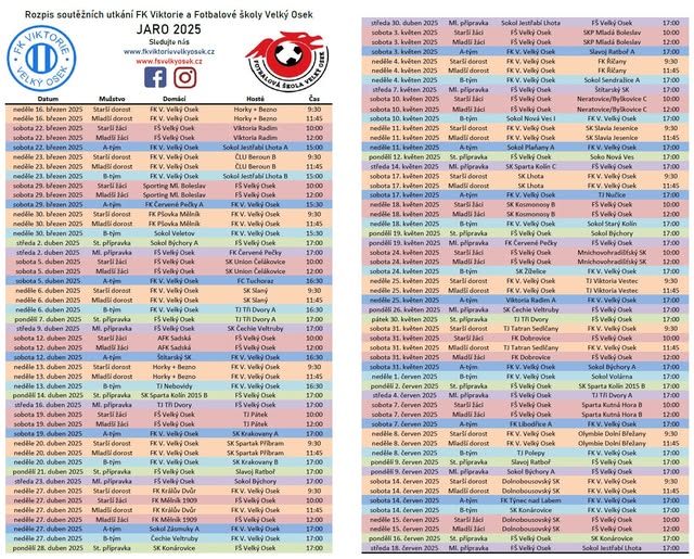 Rozpis soutěžních utkání jednotlivých kategorií Fotbalové školy a FK Viktorie Velký Osek pro jarní část sezóny 2025 (PDF verze ke stažení na www. fsvelkyosek. cz) 🔵⚪💪⚽.