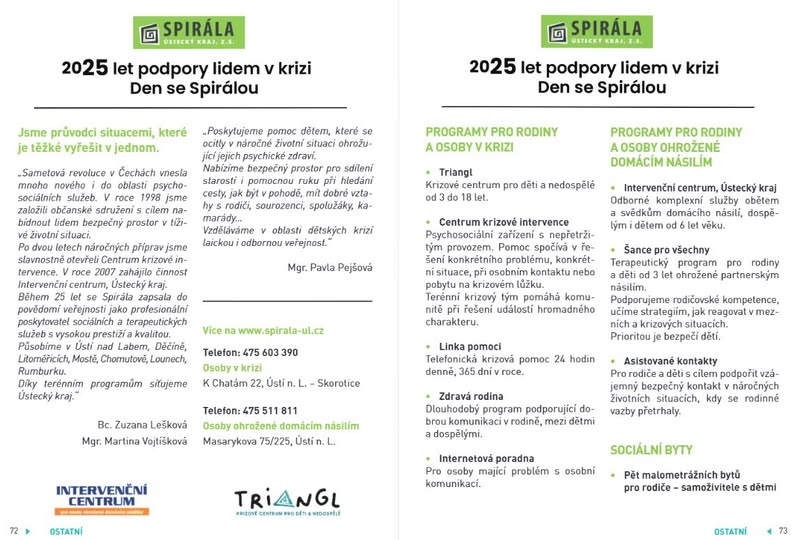 Pomáháme lidem v náročných životních situacích a osobám ohroženým domácím násilím. Naše služby a kontakty: https://spirala-ul.cz/kontakt/