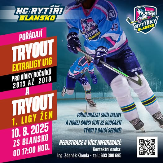 🏒🔥 TRYOUT U16 DÍVEK a ŽEN – HC RYTÍŘKY BLANSKO 🔥🏒 Chceš se stát součástí týmu, který bojuje srdcem a má velké cíle. Přijď na na TRYOUT hráček pro EXTRALIGU U16 a 1. ligu žen.