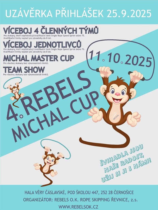 🐵 4. REBELS MICHAL CUP 🐵 🐵 Rope skippingový víceboj jednotlivců a týmů v rychlostních disciplínách se koná 11. 10.