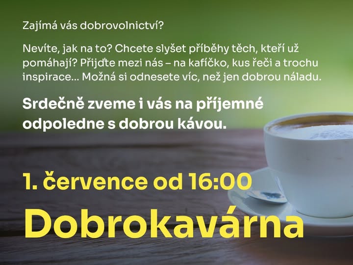 📅 Srdečně zveme na Dobrokavárnu. ☕️ Pokud máte zájem o dobrovolnictví nebo se chcete dozvědět víc o aktivitách našeho Dobrovolnického centra, určitě nás navštivte. 📍 Kdy: 1.