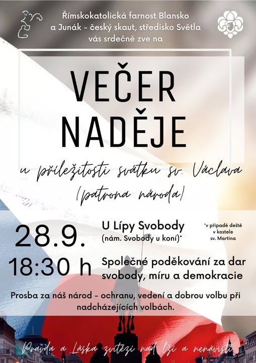 ✨ Zveme vás na Večer naděje ✨ V neděli 28. září 2025 v 18:30 se u Lípy svobody na náměstí Svobody (u koní) v Blansku společně setkáme, abychom poděkovali za dar svobody, míru a demokracie. 🌿 Při příležitosti svátku sv.