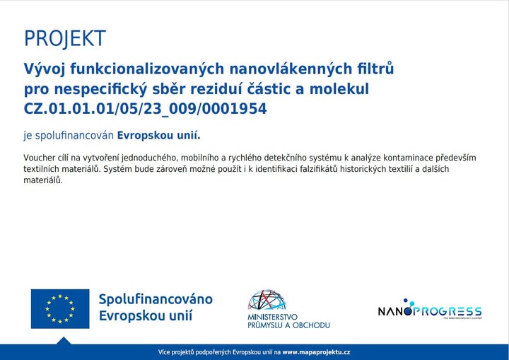 Multipotenciál nanovláken lze spatřit i v dalším realizovaném projektu, do kterého se Nanoprogress zapojil. V tomto projektu vyvinutá nanovlákna plní funkci ultrasensitivní membrány vhodné pro použití jako nespecifický sensor pro distanční sběr reziduí mikroskopických částic a molekul. Výsledný produkt je určen k analýze kontaminace především textilních materiálů.