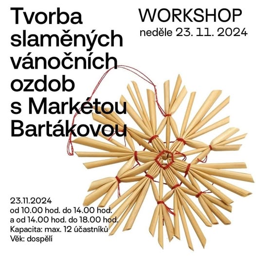 Srdečně vás zveme na kurz, kde si vyrobíte svoje vlastní tradiční vánoční ozdobičky ze slámy. Paní Markéta Bartáková se pletení a vázání slaměných ozdob, výuce a propagaci této činnosti věnuje nepřetržitě od roku 1980. Důležitou součástí její práce je výroba slaměných zvykoslovných předmětů, muších rájů a dožínkových věnců pro výstavní účely, případně i opravy muzejních sbírkových předmětů ze slámy.