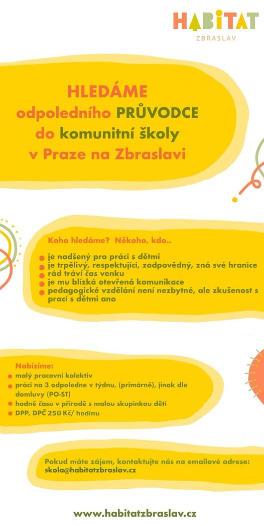HLEDÁME ODPOLEDNÍHO PRŮVODCE 🌞 Z rodinných důvodů už s dětmi nemůže trávit tolik času naše skvělá odpolední průvodkyně, a proto hledáme náhradu. Hledáme někoho, kdo by měl čas tři odpoledne v týdnu PO - ST od 13:00 (12:30) do 16:30. Děti tráví odpoledne neřízenou činností, podle svého zájmu.