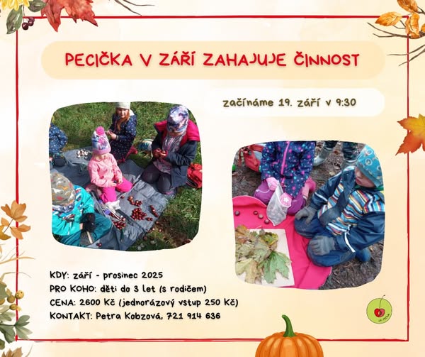 Pecička pro děti do 3 let začíná už 19. září. Scházíme se každý pátek od 9:30 v areálu našeho lesního klubu ☺️ Ještě jsou nějaká volná místa, pro informace kontaktuje Peťu Kobzovou - viz plakátek 👇.