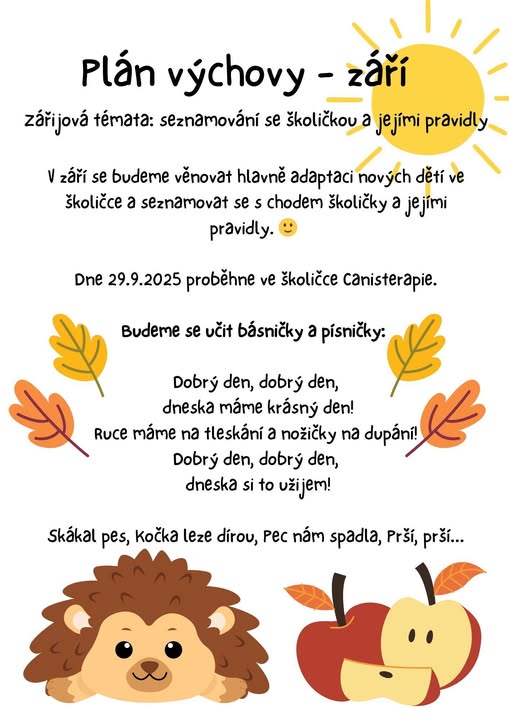 Vážení rodiče, přikládáme plán na září. 😊🍂 Krásné slunné dny ☀️ Vám přeje Meteorka ⭐️.