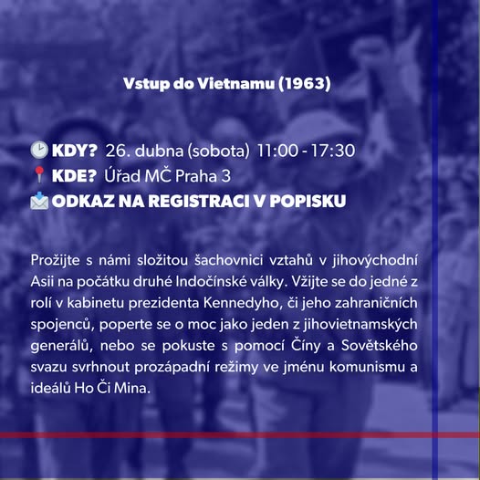 Nemůžeš se dočkat týdnů v Plzni, ale simulace Konference v Helsinkách tě neláká. 🇺🇸🦅 Přihlas se na simulaci Vstupu USA do Vietnamu přes formulář na odkazu https://forms. gle/Y4a9PLaXwfTteaej7.