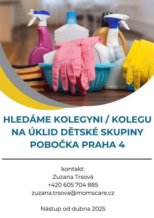 🫧 Hledáme kolegyni / kolegu na pravidelný úklid naší pobočky dětské skupiny U Mominky na Praze 4. ☑ spolupráce na IČO nebo DPP, ☑ úklid pravidelně 5x týdně, ☑ odpoledne / večer, ☑ nové prostory. 📍 Nástup od dubna 2025, ideální pro rodiče na MD / RD, seniory nebo studenty.
