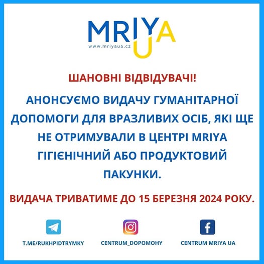 Шановні відвідувачі. Анонсуємо видачу гуманітарної допомоги для вразливих осіб, які ще не отримували в центрі MRIYA гігієнічний або продуктовий пакунки. До вразливих категорій належать: 🔹люди віком від 60 років; 🔹матері, які доглядають за дітьми до 14 років; 🔹матері двох та більше дітей; 🔹люди з інвалідністю та особи, що доглядають їх.