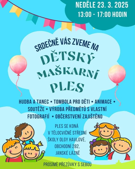 Srdečně vás zveme na Dětský maškarní ples. V neděli 23. března 2025 od 13:00 do 17:00 se v tělocvičně Střední školy Olgy Havlové roztančí malí i velcí.