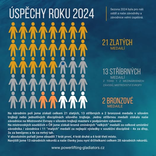 Úspěchy roku 2024 --------------------------------- Na národním poli jsme získali celkem 21 zlatých, 13 stříbrných a 2 bronzové medaile v silovém trojboji nebo jednotlivých disciplínách silového trojboje. Jednu stříbrnou medaili získala naše závodnice na Mistrovství Evropy v silovém trojboji masters v podpůrném vybavení. Na mistrovských soutěžích v ČR jsme získali kromě zmíněných “velkých” medailí za celkové umístění závodníka / závodnice i 11 “malých” medailí za nejlepší výsledky v soutěžní disciplíně - 4x za dřep, 3x za benčpres a 4x za mrtvý tah.