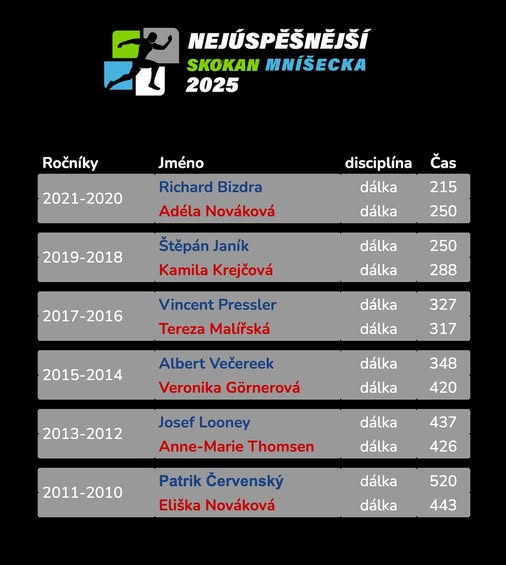 🏆🦘 NEJÚSPĚŠNĚJŠÍ SKOKAN MNÍŠECKA 2025 🥇 Děkujeme všem našim malým i větším atletům za skvělé výkony, nasazení a radost z pohybu během celé venkovní sezony 2025. 💪🔥 📊 Během celé sezony jsme evidovali výkony všech našich atletů ve skoku dalekém ze závodů a soutěží. Minulý týden měli všichni naši atleti možnost svůj výkon vylepšit — nebo si svůj první oficiální skok zaznamenat přímo v rámci běžných tréninků.