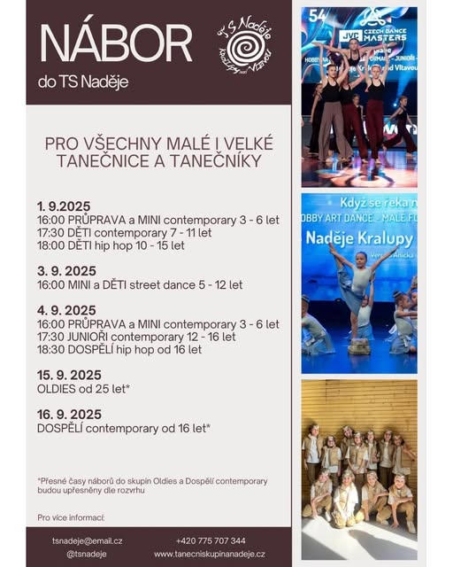 Nábory na taneční sezónu 2025/2026 🩰 Nový školní rok se blíží a s ním i příležitost stát se součástí našeho tanečního kolektivu. Pro více informací nás neváhejte kontaktovat ✨.