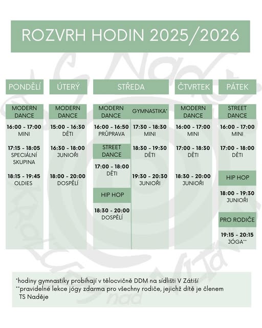 Předběžný rozvrh hodin na školní rok 2025/2026 💃 Je možné, že dojde k menším úpravám.