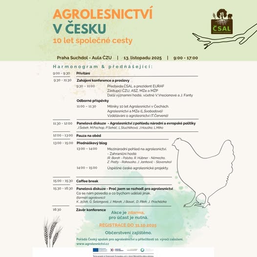 🌳KONFERENCE AGROLESNICTVÍ V ČESKU - 10 let společné cesty🌳 Už tento LISTOPAD se s vámi sejdeme na konferenci, která slaví kulaté 10. VÝROČÍ Českého spolku pro agrolesnictví. 🥳 Oslavte s námi dekádu naší práce v aule České zemědělské univerzity v Praze.