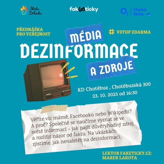 🧠 Věříte všemu, co čtete na internetu. Přijďte na veřejnou, bezplatnou přednášku o dezinformacích, médiích a zdrojích a naučte se rozeznat fakta od manipulace. 📣 👁🗨 Jak poznat důvěryhodný zdroj.