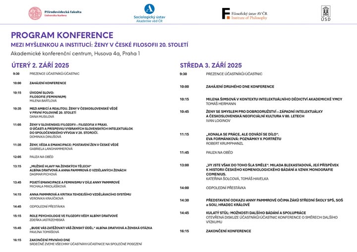 Rádi bychom Vás pozvali na konferenci Mezi myšlenkou a institucí: ženy v české filosofii 20. století, kterou pořádají naši kolegové z Katedra filosofie a dějin přírodních věd ve spolupráci s Ústavem pro soudobé dějiny, Filosofickým ústavem a Sociologickým ústavem Akademie věd České republiky. Konference začíná jíž zítra v 10:00 v Akademickém konferenčním centru, FLÚ AV ČR, Husova 236/4a, Praha 1.