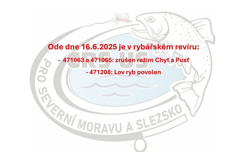 V rybářském revíru 471063 Odra 1, 471065 Odra 2 je od 16. 6. 2025 zrušen režim Chyť a Pusť.