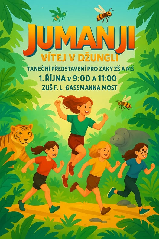 🌿 JUMANJI – Vítej v džungli. 🌿 Zveme vás na taneční představení pro žáky ZŠ a MŠ plné dobrodružství, napětí a zábavy. 📅 1.