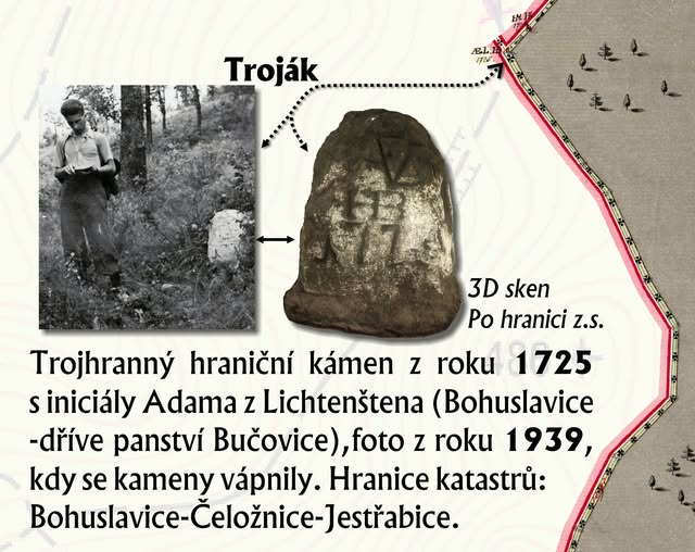 I tento trojmezní historický hraniční kámen nechal v roce 2017 spolek Po hranici naskenovat, zajímavostí jsou zbytky bílého vápnění, které se v minulosti používalo. Výřez je z velkého informačního panelu obce Čeložnice. Odkaz na 3D sken, včetně možnosti náhledu ve virtuální realitě, zde: https://skfb.