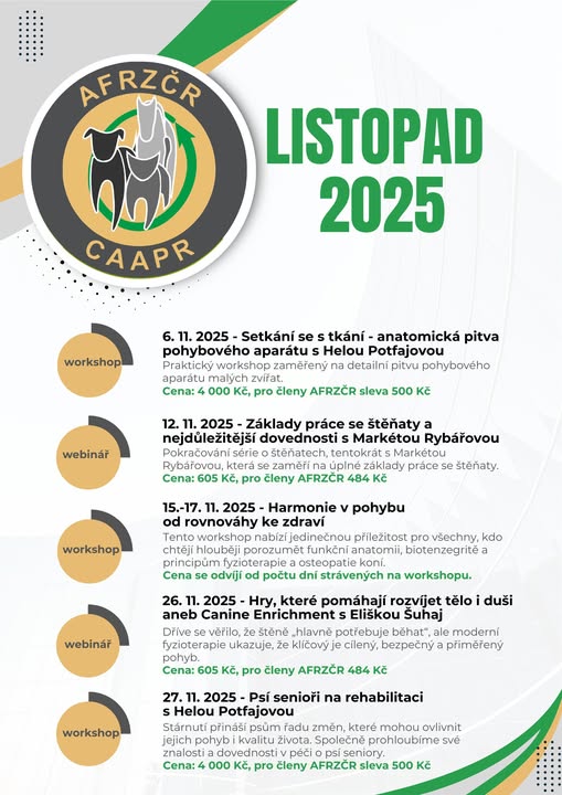 🎓 Listopad v AFRZČR = měsíc anatomie, štěňat, koní i seniorů. Listopad přináší nabitý program pro všechny, kdo chtějí porozumět pohybu napříč věkem i druhem – od štěňat přes seniory až po koně. Čekají vás praktické workshopy, anatomické pitvy i inspirativní webináře vedené odborníky z praxe.