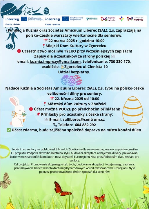 🌷🐣 Polsko-české velikonoční dílny pro seniory. 🌷🐣 📢 Nadace Kuźnia a Societas Amicuum Liberec (SAL) zvou všechny seniory na jedinečné polsko-české velikonoční dílny. To je skvělá příležitost kreativně strávit čas, poznat velikonoční tradice sousedů a budovat přeshraniční přátelství.