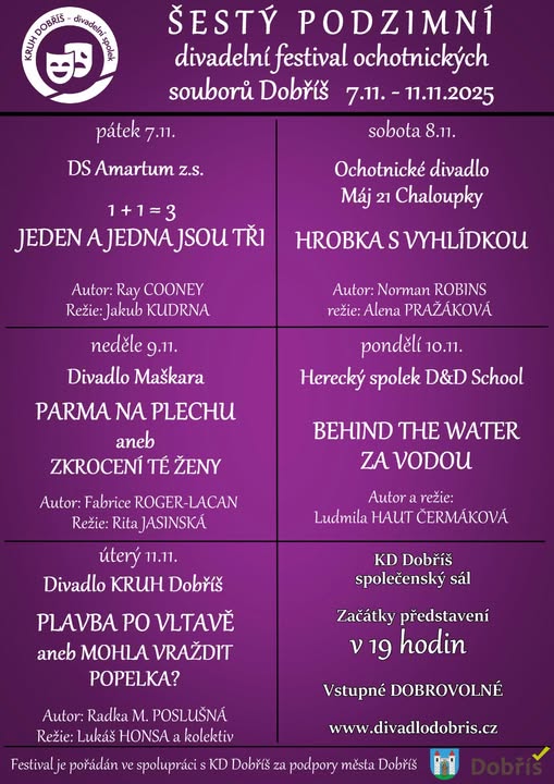 Je nám velkou ctí 🎭, že už za necelý měsíc, v pátek 7. 11. , otevře naše představení Jeden a jedna jsou tři v pořadí již šestý Podzimní divadelní festival ochotnických souborů Dobříš, který pořádá Divadlo Kruh Dobříš ve spolupráci s Kulturní dům Dobříš.