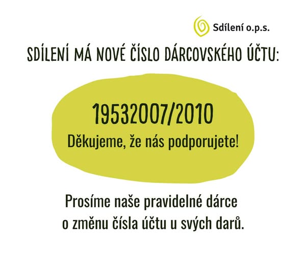 💳 Sdílení má nové číslo dárcovského účtu: 19532007/2010 🔄 Pokud nás podporujete pravidelnými dary, budeme moc vděční, když si číslo účtu ve svých trvalých příkazech změníte. 💚 Vaše podpora je pro nás nesmírně důležitá a moc si jí vážíme. 🙏 Děkujeme, že stojíte při nás.