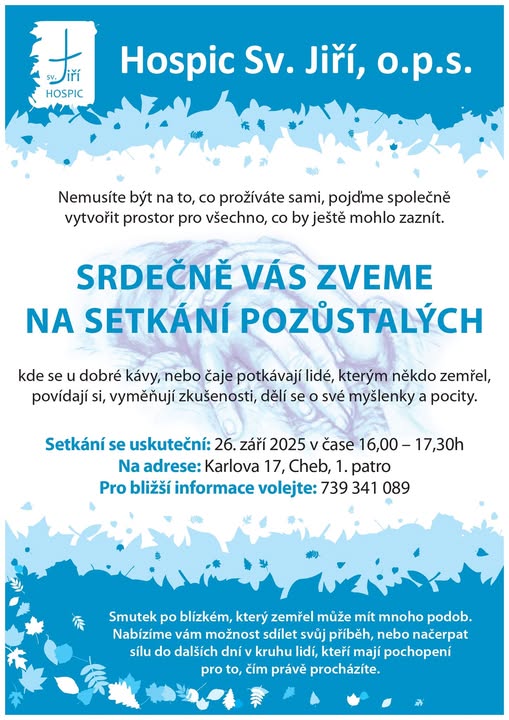 Ztráta blízkého bolí — a každý ji prožívá po svém. Na našem setkání pozůstalých se můžete svobodně podělit o své pocity, vyslechnout příběhy druhých, nebo jen tiše být mezi lidmi, kteří rozumí tomu, čím procházíte. Není nutné nic říkat — stačí přijít.