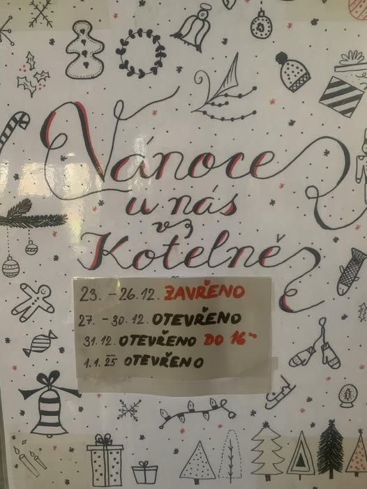 Otevírací doba během svátků😉 1. 1. 2025 máme otevřeno🍻🍹🥤a Těšíme se na Vás🙂.