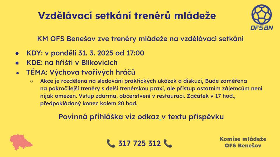 KOMISE MLÁDEŽE | Vzdělávání KM OFS Benešov zve trenéry mládeže na vzdělávací setkání 📅 v pondělí 31. 3. 2025 od 17:00 📌 na hřišti v Bílkovicích ℹ️ Výchova tvořivých hráčů Akce je rozdělena na sledování praktických ukázek a diskuzi, Bude zaměřena na pokročilejší trenéry s delší trenérskou praxí, ale přístup ostatním zájemcům není nijak omezen.