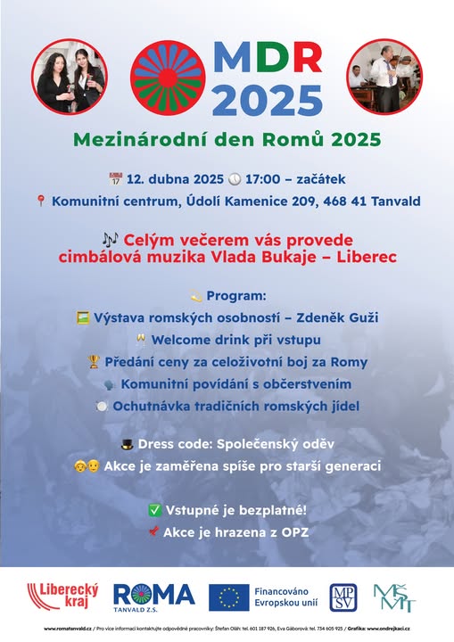 🌍✨ MEZINÁRODNÍ DEN ROMŮ 2025 ✨🌍 📅 12. dubna 2025 🕔 Začátek v 17:00 📍 Komunitní centrum, Údolí Kamenice 209, 468 41 Tanvald 📞 Kontakt: +420 608 396 500 Přijďte s námi oslavit bohatou romskou kulturu a tradiční hodnoty. 🖤💛❤️ Čeká vás jedinečný večer plný hudby, historie a skvělého jídla.