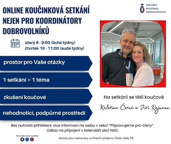 Řešíte problematickou situaci v organizaci nebo s dobrovolníky. Potřebujete se na něco podívat "jinýma očima". Naše webináře se zkušenými transformativními kouči Katkou a Jiřím jsou tu pro vás.