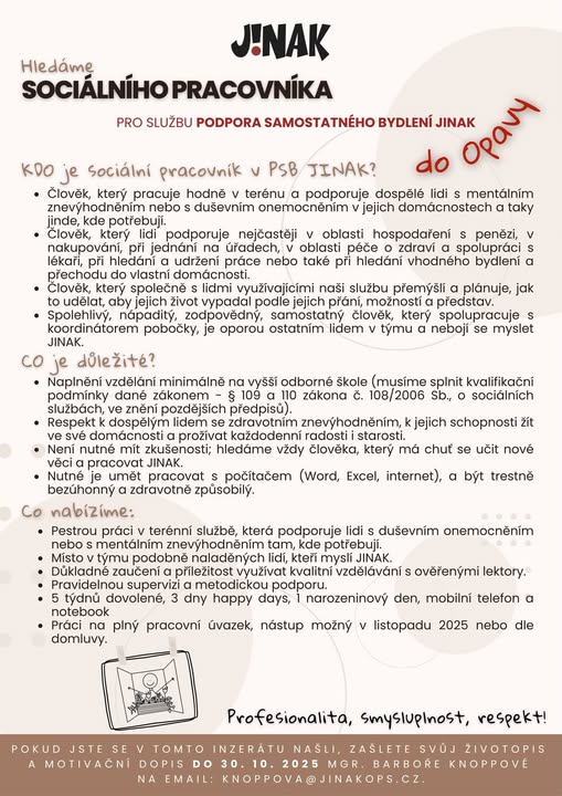 Do naší služby Podpora samostatného bydlení JINAK v Opavě hledáme novou kolegyňku nebo kolegu na pozici Sociálního pracovníka na plný pracovní úvazek. Koukněte se na inzerát a pokud byste se v něm našli, nebo znáte někoho, koho můžete doporučit, ozvěte se nám. Těšíme se 😊.