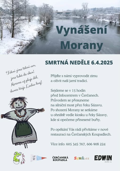 🌨️ Přijďte s námi společně vyprovodit zimu a uvítat jaro. 🌷 Zveme všechny místní rodiny ke společnému průvodu za zvuku tradičních halekaček 🎶. 📌 Vynášení Morany 🗓️ SMRTNÁ NEDĚLE 6.