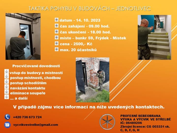 Se společností PROFESNÍ SEBEOBRANA připravujeme v termínu 14. 10. 2023 seminář TAKTIKA POHYBU V BUDOVÁCH - JEDNOTLIVEC.