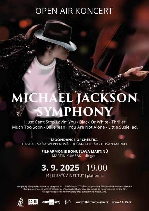 MICHAEL JACKSON SYMPHONY Na začátku září ožije platforma BAŤOVA INSTITUTU rytmy legendárního The King of Pop. Repertoár třináctinásobného držitele ceny Grammy poskytuje nekonečnou inspiraci, kterou se rozhodl využít dirigent Martin Kumžák. Vytvořil originální aranže několika Jacksonových hitů, které oživí čtyři talentovaní zpěváci – Dasha, Naďa Wepperová, Dušan Kollár a Dušan Marko, spolu s Moondance Orchestrem, jedním z nejlepších českých tanečních orchestrů a tradičním filharmonickým tělesem.