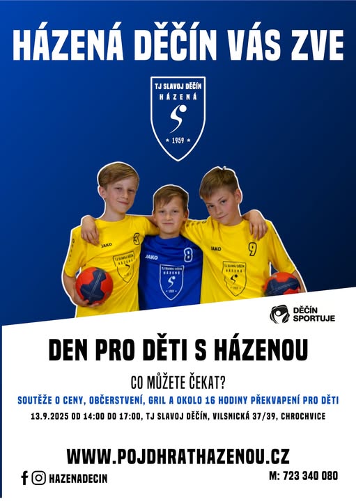 DEN PRO DĚTI S HÁZENOU Zveme vás na sportovní den pro děti s házenou, který se bude konat na Slavoji v sobotu 13. září od 14:00. #hazenadecin, #pojdhrathazenou, #decinsportuje.