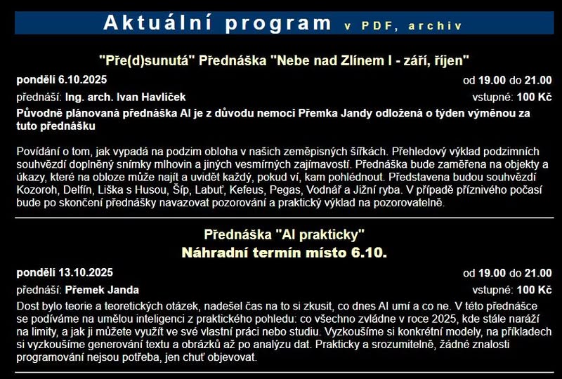Jaké novinky a akce plánuje Zlínská astronomická společnost na příští měsíce?