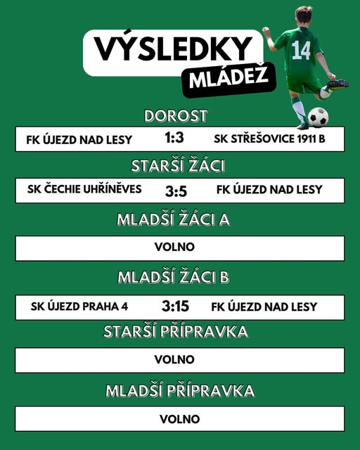 VÝSLEDKY MLÁDEŽ⚽️ Dorost FK Újezd nad Lesy 🆚 SK Střešovice 1911 B ❌ 1:3 Starší žáci SK Čechie Uhříněves 🆚 FK Újezd nad Lesy ✅ 3:5 Mladší žáci A VOLNO Mladší žáci B SK Újezd Praha 4 🆚 FK Újezd nad Lesy ✅ 3:15 Starší přípravka VOLNO Mladší přípravka VOLNO #fkujezd #mladez.