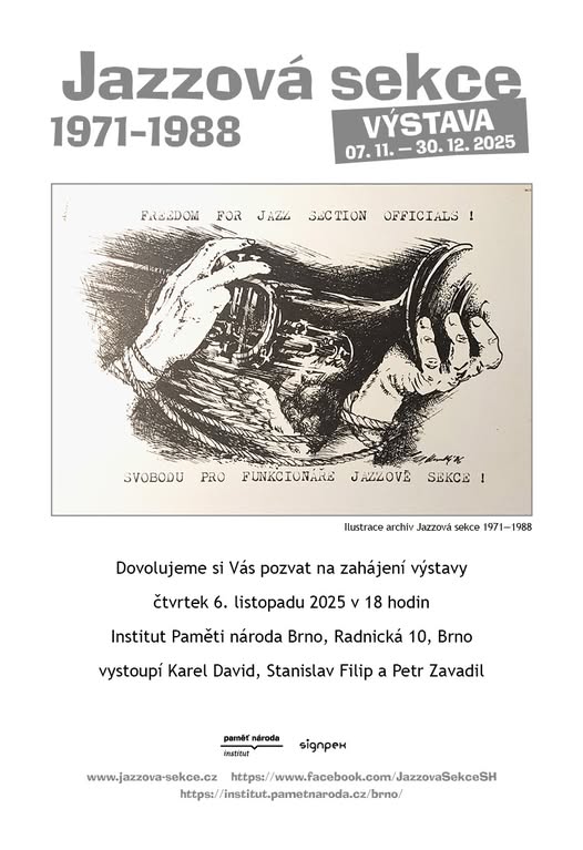 Jazzová sekce 1971-1988 zve ve spolupráci s Institutem Paměti národa Brno na výstavu. Součástí vernisáže bude krátká beseda na které vystoupí Tomáš Křivánek, Marcela Krčmářová a Ivan Prokop. O hudební doprovod se postarají Karel David, Stanislav Filip a Petr Zavadil.