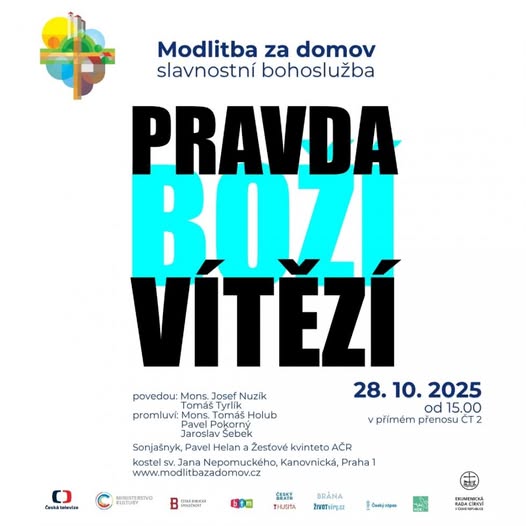 Srdečně Vás zveme ke sledování televizního přenosu (nebo přímo k osobní účasti na místě 🙂) slavnostní bohoslužby v rámci projektu "Modlitba za domov", kdy se v den státního svátku 28. října 2025 již podevatenácté spojí řada českých církví, aby společně oslavily svátek vzniku Československa — letos s tématem „Pravda vítězí, i když na čas poražena bývá. “ ➡️ Přímý přenos z kostela sv.